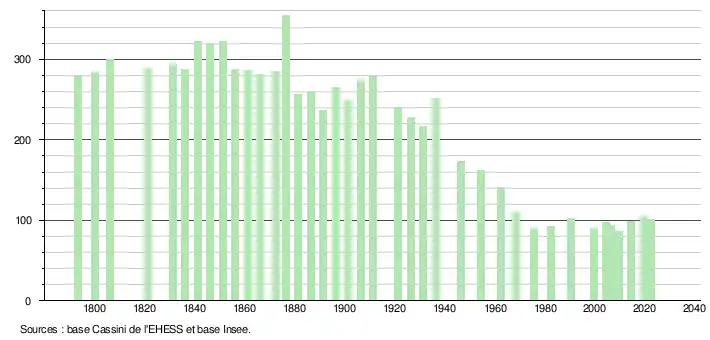 L'évolution du nombre d'habitants est connue à travers les recensements de la population effectués dans la commune depuis 1793. Pour les communes de moins de 10 000 habitants, une enquête de recensement portant sur toute la population est réalisée tous les cinq ans, les populations de référence des années intermédiaires étant quant à elles estimées par interpolation ou extrapolation[18]. Pour la commune, le premier recensement exhaustif entrant dans le cadre du nouveau dispositif a été réalisé en 2004[19].