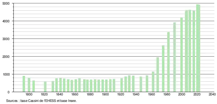 L'évolution du nombre d'habitants est connue à travers les recensements de la population effectués dans la commune depuis 1793. Pour les communes de moins de 10 000 habitants, une enquête de recensement portant sur toute la population est réalisée tous les cinq ans, les populations de référence des années intermédiaires étant quant à elles estimées par interpolation ou extrapolation[25]. Pour la commune, le premier recensement exhaustif entrant dans le cadre du nouveau dispositif a été réalisé en 2005[26].