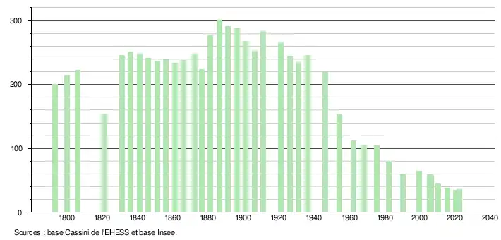 L'évolution du nombre d'habitants est connue à travers les recensements de la population effectués dans la commune depuis 1793. Pour les communes de moins de 10 000 habitants, une enquête de recensement portant sur toute la population est réalisée tous les cinq ans, les populations de référence des années intermédiaires étant quant à elles estimées par interpolation ou extrapolation[24]. Pour la commune, le premier recensement exhaustif entrant dans le cadre du nouveau dispositif a été réalisé en 2005[25].