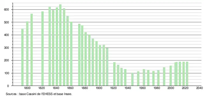 L'évolution du nombre d'habitants est connue à travers les recensements de la population effectués dans la commune depuis 1793. Pour les communes de moins de 10 000 habitants, une enquête de recensement portant sur toute la population est réalisée tous les cinq ans, les populations de référence des années intermédiaires étant quant à elles estimées par interpolation ou extrapolation[19]. Pour la commune, le premier recensement exhaustif entrant dans le cadre du nouveau dispositif a été réalisé en 2007[20].