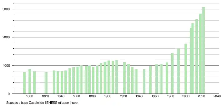 L'évolution du nombre d'habitants est connue à travers les recensements de la population effectués dans la commune depuis 1793. Pour les communes de moins de 10000habitants, une enquête de recensement portant sur toute la population est réalisée tous les cinqans, les populations de référence des années intermédiaires étant quant à elles estimées par interpolation ou extrapolation[37]. Pour la commune, le premier recensement exhaustif entrant dans le cadre du nouveau dispositif a été réalisé en 2008[38].