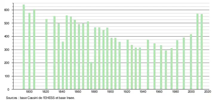L'évolution du nombre d'habitants est connue à travers les recensements de la population effectués dans la commune depuis 1793. À partir du , les populations légales des communes sont publiées annuellement dans le cadre d'un recensement qui repose désormais sur une collecte d'information annuelle, concernant successivement tous les territoires communaux au cours d'une période de cinq ans. Pour les communes de moins de 10 000 habitants, une enquête de recensement portant sur toute la population est réalisée tous les cinq ans, les populations légales des années intermédiaires étant quant à elles estimées par interpolation ou extrapolation[11]. Pour la commune, le premier recensement exhaustif entrant dans le cadre du nouveau dispositif a été réalisé en 2007[12],[Note 2].
