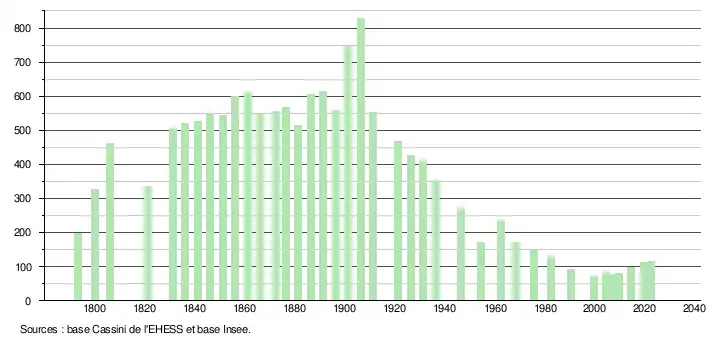 L'évolution du nombre d'habitants est connue à travers les recensements de la population effectués dans la commune depuis 1793. Pour les communes de moins de 10 000 habitants, une enquête de recensement portant sur toute la population est réalisée tous les cinq ans, les populations de référence des années intermédiaires étant quant à elles estimées par interpolation ou extrapolation[14]. Pour la commune, le premier recensement exhaustif entrant dans le cadre du nouveau dispositif a été réalisé en 2004[15].