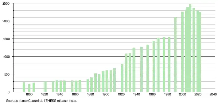 L'évolution du nombre d'habitants est connue à travers les recensements de la population effectués dans la commune depuis 1793. Pour les communes de moins de 10 000 habitants, une enquête de recensement portant sur toute la population est réalisée tous les cinq ans, les populations de référence des années intermédiaires étant quant à elles estimées par interpolation ou extrapolation[30]. Pour la commune, le premier recensement exhaustif entrant dans le cadre du nouveau dispositif a été réalisé en 2004[31].