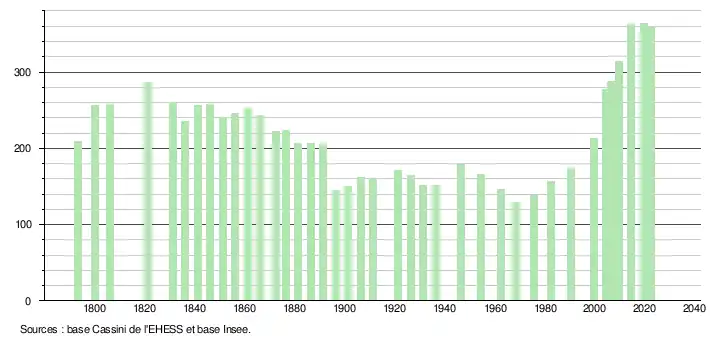 L'évolution du nombre d'habitants est connue à travers les recensements de la population effectués dans la commune depuis 1793. Pour les communes de moins de 10 000 habitants, une enquête de recensement portant sur toute la population est réalisée tous les cinq ans, les populations de référence des années intermédiaires étant quant à elles estimées par interpolation ou extrapolation[23]. Pour la commune, le premier recensement exhaustif entrant dans le cadre du nouveau dispositif a été réalisé en 2004[24].