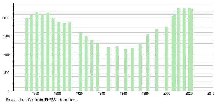 L'évolution du nombre d'habitants est connue à travers les recensements de la population effectués dans la commune depuis 1872. Pour les communes de moins de 10 000 habitants, une enquête de recensement portant sur toute la population est réalisée tous les cinq ans, les populations de référence des années intermédiaires étant quant à elles estimées par interpolation ou extrapolation[22]. Pour la commune, le premier recensement exhaustif entrant dans le cadre du nouveau dispositif a été réalisé en 2005[23].
