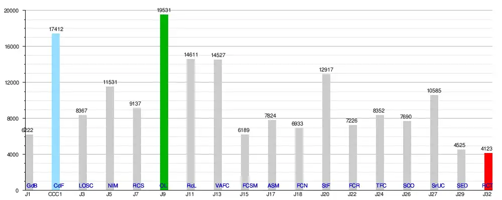177.702 spectateurs ont assisté à des rencontres de l'AS Saint-Etienne en 18 rencontres. Soit une moyenne de 9872 spectateurs.