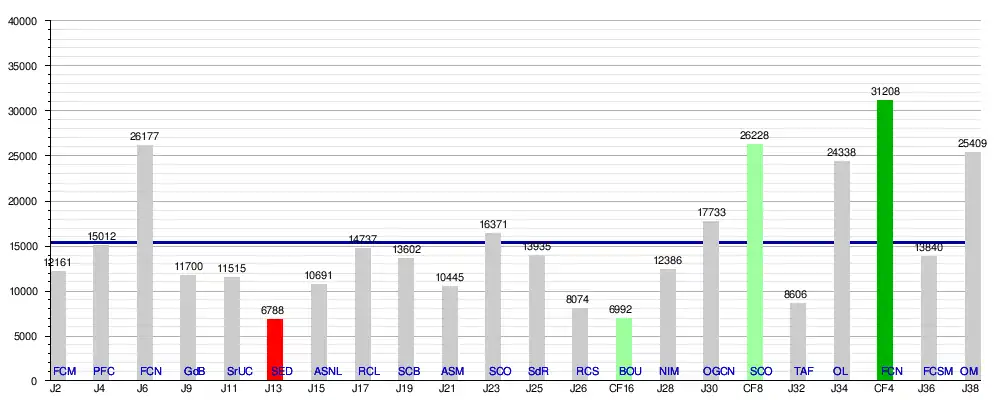 337 948 spectateurs ont assisté à une rencontre au stade cette saison, soit une moyenne de 15 361 par match. C'est en augmentation de 4000 spectateurs de moyenne en plus par rapport à la saison précédente.