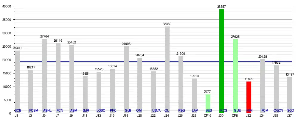 409 863 spectateurs ont assisté à une rencontre au stade cette saison, soit une moyenne de 19 517 par match.