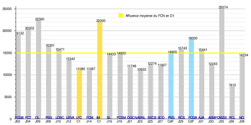 - de 284 132 spectateurs en 19 rencontres de Division 1, soit une moyenne de 14 954/match.