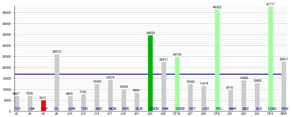 374 881 spectateurs ont assisté à une rencontre au stade cette saison, soit une moyenne de 17 040 par match. Les 2 plus grandes affluences sont des rencontres de Coupe de France.