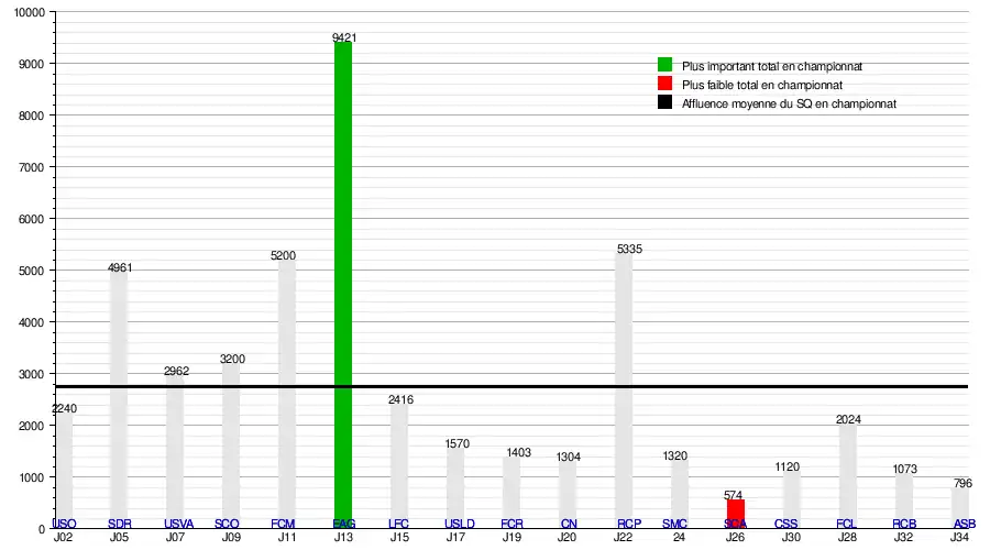 - de 46 919 spectateurs en 17 rencontres de Division 2, soit une moyenne de 2 760/match.