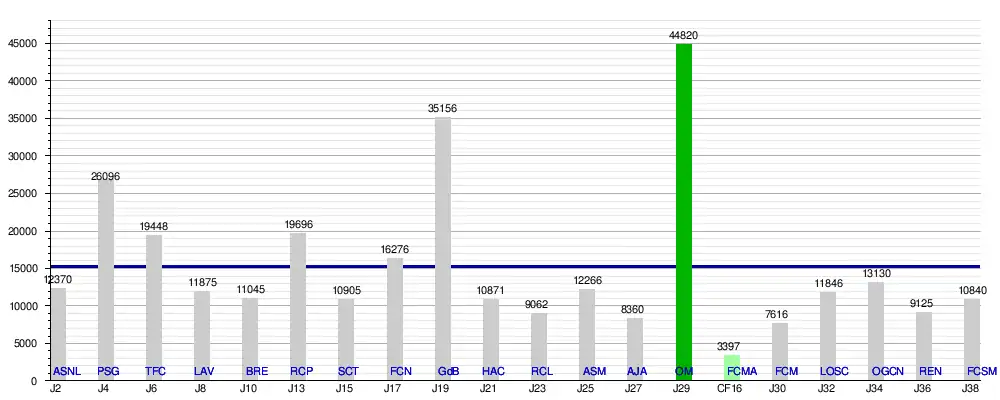 305 010 spectateurs ont assisté à une rencontre au stade cette saison, soit une moyenne de 15 250 par match.