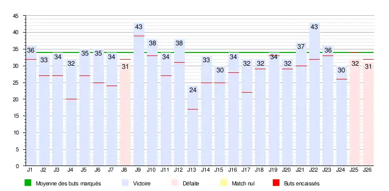 Ce graphique représente le nombre de buts marqués lors de chaque journée du championnat.