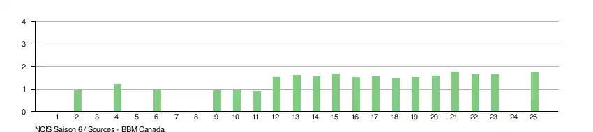 - ↑ N'étant pas diffusé en simultané durant l'automne, l'audience est divisée entre ceux qui regardent NCIS sur CBS (non comptabilisés) au Canada et ceux qui la regardent sur Global le lendemain ; ce qui fait paraître les cotes d'écoute plus faibles qu'en réalité