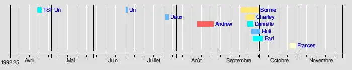L’ouragan Andrew a cependant marqué les records en étant le plus coûteux de l'histoire des États-Unis, avant l’ouragan Katrina en 2005, et seulement le troisième ouragan de catégorie 5 dans l’échelle de Saffir-Simpson à frapper ce pays entre 1900 et 1992[1]. En 1992, on peut également mentionner les ouragans Bonnie et Charley qui ont tous les deux touchés les Açores.