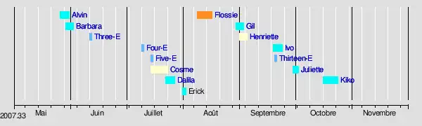 La liste des noms qui sera utilisée pour nommer les tempêtes qui se formeront dans le bassin cyclonique de l'océan Pacifique nord-est durant l'année 2007 est la même que celle de la saison 2001. Les noms qui ne sont pas retirés de cette liste seront à nouveau utilisés lors de la saison 2013.