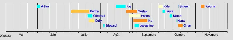 Ouragan Omar (2008)Tempête tropicale Marco (2008)Ouragan Kyle (2008)Ouragan IkeOuragan Hanna (2008)Ouragan Gustav (2008)Tempête tropicale Fay (2008)Tempête tropicale Arthur (2008)
