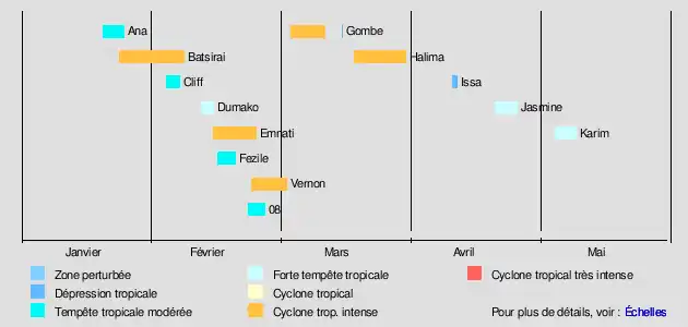 | Le plus intense | Batsirai (195 km/h) | ||||||||||||||||||||