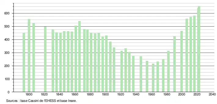 L'évolution du nombre d'habitants est connue à travers les recensements de la population effectués dans la commune depuis 1793. Pour les communes de moins de 10 000 habitants, une enquête de recensement portant sur toute la population est réalisée tous les cinq ans, les populations de référence des années intermédiaires étant quant à elles estimées par interpolation ou extrapolation[15]. Pour la commune, le premier recensement exhaustif entrant dans le cadre du nouveau dispositif a été réalisé en 2006[16].