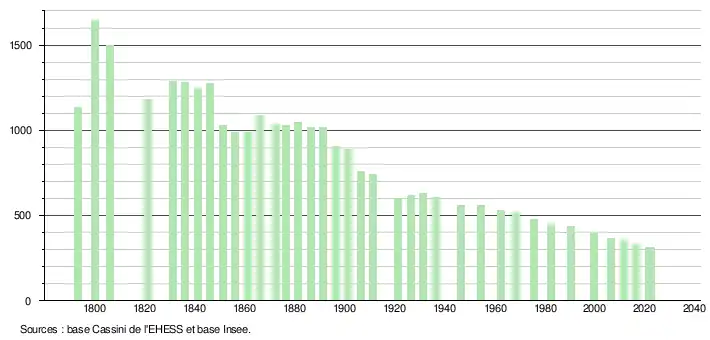 L'évolution du nombre d'habitants est connue à travers les recensements de la population effectués dans la commune depuis 1793. Pour les communes de moins de 10 000 habitants, une enquête de recensement portant sur toute la population est réalisée tous les cinq ans, les populations de référence des années intermédiaires étant quant à elles estimées par interpolation ou extrapolation[29]. Pour la commune, le premier recensement exhaustif entrant dans le cadre du nouveau dispositif a été réalisé en 2006[30].