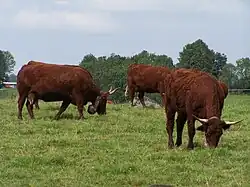 La salers est une race bovine française caractérisée par sa robe de couleur acajou et plus rarement noir ébène.