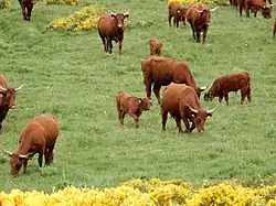 - ↑ La race de « North-Devon », bien que plus petite du fait, a la même robe, le même poil et la même forme de tête que les Salers. Elle y serait arrivée d'Auvergne avec des convois romains.