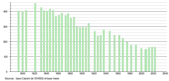 L'évolution du nombre d'habitants est connue à travers les recensements de la population effectués dans la commune depuis 1793. Pour les communes de moins de 10 000 habitants, une enquête de recensement portant sur toute la population est réalisée tous les cinq ans, les populations de référence des années intermédiaires étant quant à elles estimées par interpolation ou extrapolation[16]. Pour la commune, le premier recensement exhaustif entrant dans le cadre du nouveau dispositif a été réalisé en 2007[17].