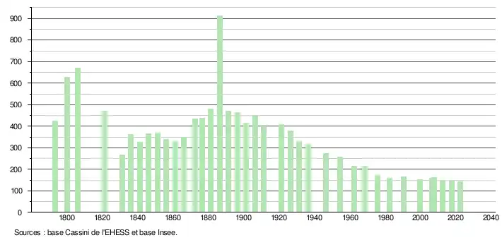 L'évolution du nombre d'habitants est connue à travers les recensements de la population effectués dans la commune depuis 1793. Pour les communes de moins de 10 000 habitants, une enquête de recensement portant sur toute la population est réalisée tous les cinq ans, les populations de référence des années intermédiaires étant quant à elles estimées par interpolation ou extrapolation[12]. Pour la commune, le premier recensement exhaustif entrant dans le cadre du nouveau dispositif a été réalisé en 2007[13].