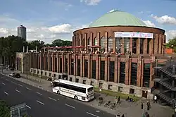 La salle polyvalente est construite par l'architecte Wilhelm Kreis. Pour ce faire, il se concerte avec Robert Meyer, le directeur de son client, la Société des immeubles de bureaux (de) de Düsseldorf. Dans son architecture monumentale, Kreis pourrait s'être inspiré du château Saint-Ange à Rome et du Projet d’Opéra d'Étienne-Louis Boullée. La façade en briques de l'édifice circulaire, qui s'élève sur un large soubassement accessible par un toit en terrasse, est sculptée par des contreforts et des couches de briques, et présente à son extrémité supérieure un ornement expressionniste unique en son genre, qui contribue à donner à ce bâtiment d'apparence sérieuse et massive un aspect général artistiquement et artisanalement raffiné.
