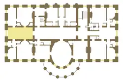 On entre dans la pièce par le Hall Central par le côté Est. La pièce contient une fenêtre-lunette sur le mur Ouest donnant sur la Colonnade de l'aile Ouest avec en arrière-plan le Old Executive Office Building. La pièce est utilisée par le président et sa famille comme un salon moins formel que la Yellow Oval Room.