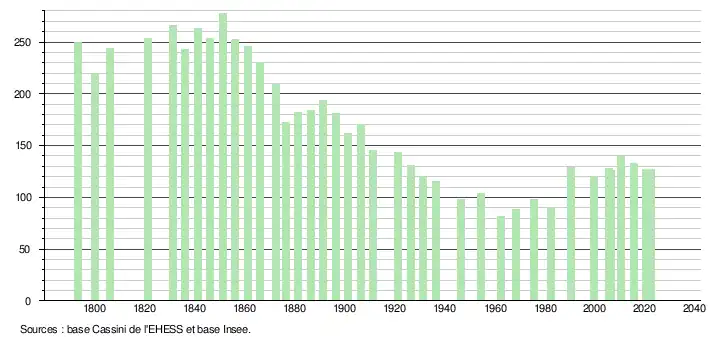 L'évolution du nombre d'habitants est connue à travers les recensements de la population effectués dans la commune depuis 1793. Pour les communes de moins de 10 000 habitants, une enquête de recensement portant sur toute la population est réalisée tous les cinq ans, les populations de référence des années intermédiaires étant quant à elles estimées par interpolation ou extrapolation[41]. Pour la commune, le premier recensement exhaustif entrant dans le cadre du nouveau dispositif a été réalisé en 2005[42].