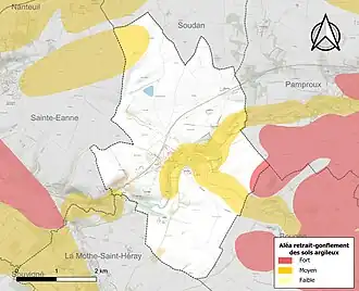 Les mouvements de terrains susceptibles de se produire sur la commune sont des tassements différentiels[16]. Le retrait-gonflement des sols argileux est susceptible d'engendrer des dommages importants aux bâtiments en cas d’alternance de périodes de sécheresse et de pluie[17]. 19,8 % de la superficie communale est en aléa moyen ou fort (54,9 % au niveau départemental et 48,5 % au niveau national)[Carte 2]. Depuis le , en application de la loi ELAN, différentes contraintes s'imposent aux vendeurs, maîtres d'ouvrages ou constructeurs de biens situés dans une zone classée en aléa moyen ou fort[Note 1],[18].