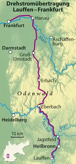 La ligne de transmission a été construite par Michail von Dolivo-Dobrowolsky et Oskar von Miller avec l'aide de la Deutsche Post Office (service postal allemand). Elle mesurait 176 km et suivait le tracé du chemin de fer. La ligne a nécessité environ 60 tonnes de fil de cuivre de 4 mm de diamètre. Le courant était généré par une centrale électrique construite à Lauffen-am-Neckar au sein d'une usine de ciment. Le générateur de l'entreprise suisse "Maschinenfabrik Oerlikon" fournissait Francfort en énergie électrique et était alimenté par une chute d'eau artificielle.