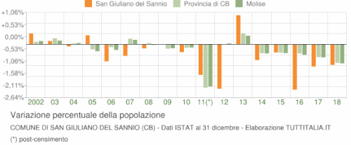 - 1 2 3 (it) « Popolazione San Giuliano del Sannio (2001-2018) Grafici su dati ISTAT », sur Tuttitalia.it (consulté le )