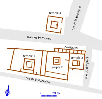 Quatre temples sont implantés de part et d'autre d'une voie structurante ouest-est de l'agglomération ; trois se trouvent au sud, un quatrième en regard, au nord. Construits au Ier siècle apr. J.-C. pour les plus anciens, ils font l'objet de remaniements successifs avant d'être abandonnés à la fin du IIIe siècle.