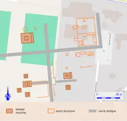 Au moins sept temples, regroupés en trois ensembles desservis par un réseau orthogonal de voies, sont fréquentés de la fin du Ier siècle apr. J.-C. jusqu'au IVe siècle. Les vestiges du site, dans l'ouest de la ville moderne comme de l'agglomération antique, sont presque intégralement recouverts.
