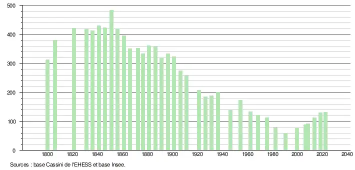 L'évolution du nombre d'habitants est connue à travers les recensements de la population effectués dans la commune depuis 1800. Pour les communes de moins de 10 000 habitants, une enquête de recensement portant sur toute la population est réalisée tous les cinq ans, les populations de référence des années intermédiaires étant quant à elles estimées par interpolation ou extrapolation[20]. Pour la commune, le premier recensement exhaustif entrant dans le cadre du nouveau dispositif a été réalisé en 2008[21].