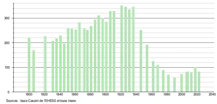 L'évolution du nombre d'habitants est connue à travers les recensements de la population effectués dans la commune depuis 1800. Pour les communes de moins de 10 000 habitants, une enquête de recensement portant sur toute la population est réalisée tous les cinq ans, les populations de référence des années intermédiaires étant quant à elles estimées par interpolation ou extrapolation[6]. Pour la commune, le premier recensement exhaustif entrant dans le cadre du nouveau dispositif a été réalisé en 2007[7].