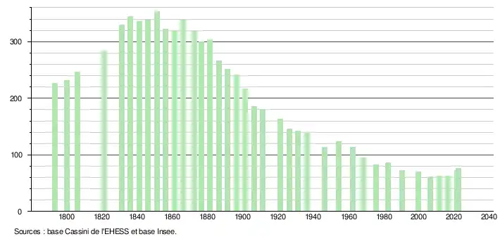 L'évolution du nombre d'habitants est connue à travers les recensements de la population effectués dans la commune depuis 1793. Pour les communes de moins de 10 000 habitants, une enquête de recensement portant sur toute la population est réalisée tous les cinq ans, les populations de référence des années intermédiaires étant quant à elles estimées par interpolation ou extrapolation[18]. Pour la commune, le premier recensement exhaustif entrant dans le cadre du nouveau dispositif a été réalisé en 2006[19].