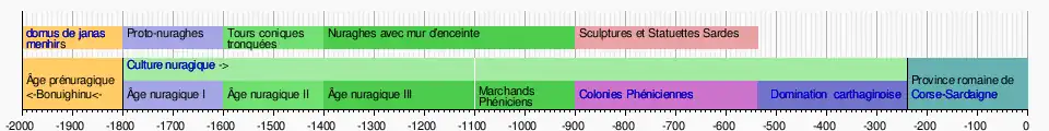 Apparaît ensuite la population plus célèbre des Nuraghes, de la culture nuragique[18], qui se développe à l'âge du bronze ancien () et qui décline progressivement à la fin de l'âge du fer () pour ne disparaître complètement qu'avec l'occupation romaine.
