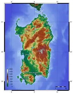 Le massif montagneux principal, le Gennargentu se trouve dans la partie centre-orientale de l’île, où il culmine à 1 834 m. Au sud, le mont Linas (1 236 m) et les monts du Sulcis s'adoucissent vers la mer avec des altitudes inférieures.