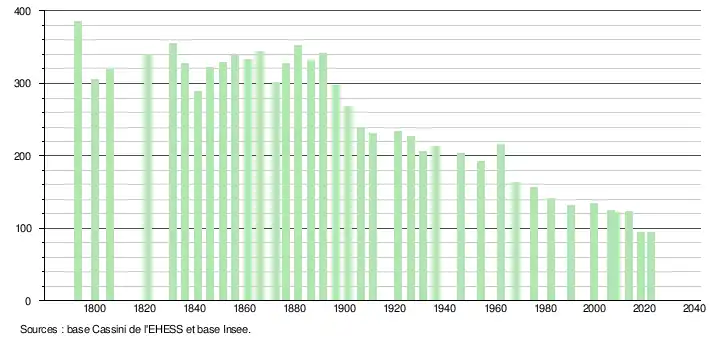 L'évolution du nombre d'habitants est connue à travers les recensements de la population effectués dans la commune depuis 1793. Pour les communes de moins de 10 000 habitants, une enquête de recensement portant sur toute la population est réalisée tous les cinq ans, les populations de référence des années intermédiaires étant quant à elles estimées par interpolation ou extrapolation[20]. Pour la commune, le premier recensement exhaustif entrant dans le cadre du nouveau dispositif a été réalisé en 2008[21].