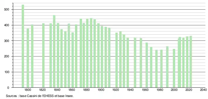 L'évolution du nombre d'habitants est connue à travers les recensements de la population effectués dans la commune depuis 1793. Pour les communes de moins de 10 000 habitants, une enquête de recensement portant sur toute la population est réalisée tous les cinq ans, les populations de référence des années intermédiaires étant quant à elles estimées par interpolation ou extrapolation[24]. Pour la commune, le premier recensement exhaustif entrant dans le cadre du nouveau dispositif a été réalisé en 2007[25].