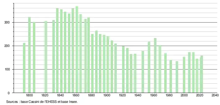 L'évolution du nombre d'habitants est connue à travers les recensements de la population effectués dans la commune depuis 1793. Pour les communes de moins de 10 000 habitants, une enquête de recensement portant sur toute la population est réalisée tous les cinq ans, les populations de référence des années intermédiaires étant quant à elles estimées par interpolation ou extrapolation[21]. Pour la commune, le premier recensement exhaustif entrant dans le cadre du nouveau dispositif a été réalisé en 2006[22].