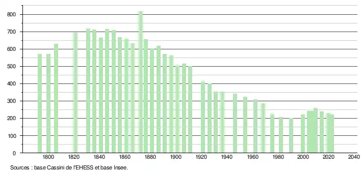 L'évolution du nombre d'habitants est connue à travers les recensements de la population effectués dans la commune depuis 1793. Pour les communes de moins de 10 000 habitants, une enquête de recensement portant sur toute la population est réalisée tous les cinq ans, les populations de référence des années intermédiaires étant quant à elles estimées par interpolation ou extrapolation[22]. Pour la commune, le premier recensement exhaustif entrant dans le cadre du nouveau dispositif a été réalisé en 2004[23].