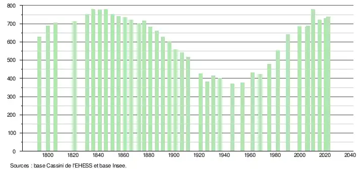 L'évolution du nombre d'habitants est connue à travers les recensements de la population effectués dans la commune depuis 1793. Pour les communes de moins de 10 000 habitants, une enquête de recensement portant sur toute la population est réalisée tous les cinq ans, les populations de référence des années intermédiaires étant quant à elles estimées par interpolation ou extrapolation[14]. Pour la commune, le premier recensement exhaustif entrant dans le cadre du nouveau dispositif a été réalisé en 2005[15].