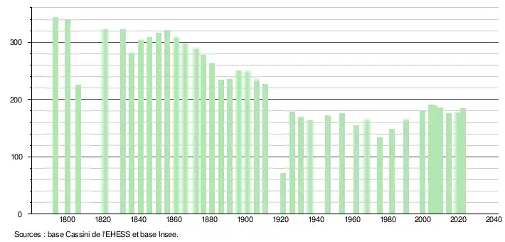 L'évolution du nombre d'habitants est connue à travers les recensements de la population effectués dans la commune depuis 1793. Pour les communes de moins de 10 000 habitants, une enquête de recensement portant sur toute la population est réalisée tous les cinq ans, les populations de référence des années intermédiaires étant quant à elles estimées par interpolation ou extrapolation[48]. Pour la commune, le premier recensement exhaustif entrant dans le cadre du nouveau dispositif a été réalisé en 2004[49].