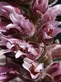 - Fleurs : roses blanchâtres en clochette le long d'une hampe florale de 10 à 40 cm portant jusqu'à 300 fleurs. 5 sépales et 5 pétales.
