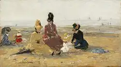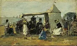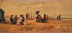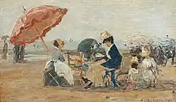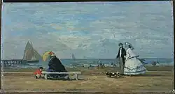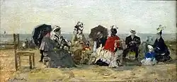 ![]() | Scène de genre | La Conversation sur la plage de Trouville | 1876 | huile sur acajou | 12,3 × 25 cm | musée Eugène-Boudin de Honfleur | Notice Joconde consulté le 22/03/2022 |